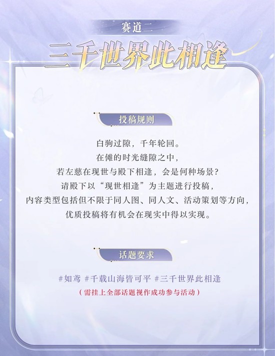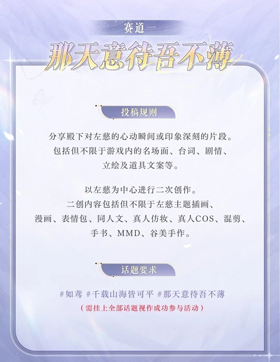 参与方式:围绕两大赛道 “那天意待吾不薄” 与 “三千世界此相逢”,根据赛道要求创作作品,并完整挂上指定话题,即可参与。