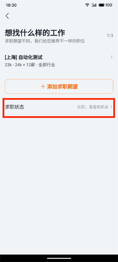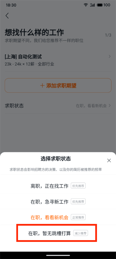4、在弹出的选项中选择【在线,暂无跳槽打算】即可完成设置。