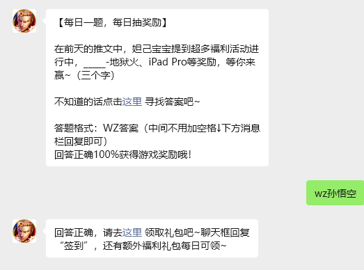 今日问题:在前天的推文中,妲己宝宝提到超多福利活动进行中,_____-地狱火、iPad Pro等奖励,等你来赢~(三个字)