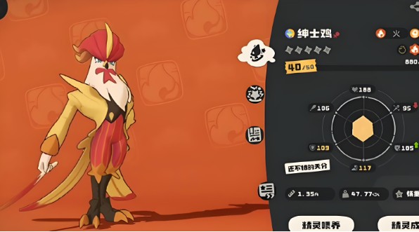 绅士鸡属于 火属性主力输出型精灵,擅长高爆发伤害。它既能持续压制敌人,也能瞬间秒杀对手,输出方式灵活,可根据战斗场景自由切换。