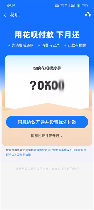 3、在花呗页面中,阅读协议后点击 【同意协议并开通】,同时可设置优先付款,即可完成开通。