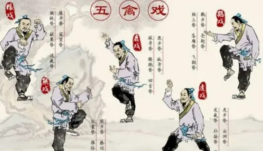 观察飞禽走兽活动姿态,用虎、鹿、猿、熊、鹤等动物形象及动作创编的一套养生健身功法。