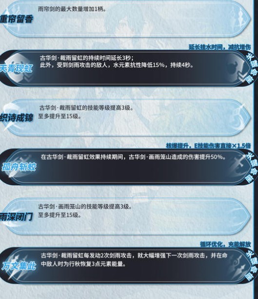 天青现虹:古华剑·裁雨留虹持续时间延长3秒;命中敌人降低其水元素抗性15%,持续4秒。