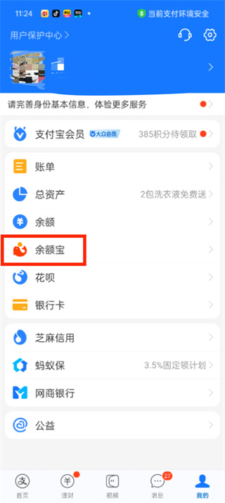 1、打开支付宝首页,点击右下角的【我的】,这里集中显示了你的账单、总资产、余额宝、花呗等服务入口。