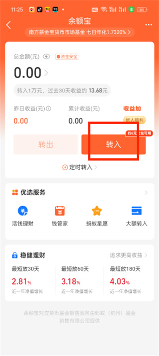 3、点击【转入】,在转入页面中选择转入方式,并输入想要转入的金额。