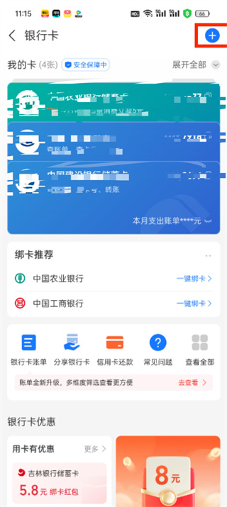 3、进入银行卡页面后,点击右上角的【+】图标;