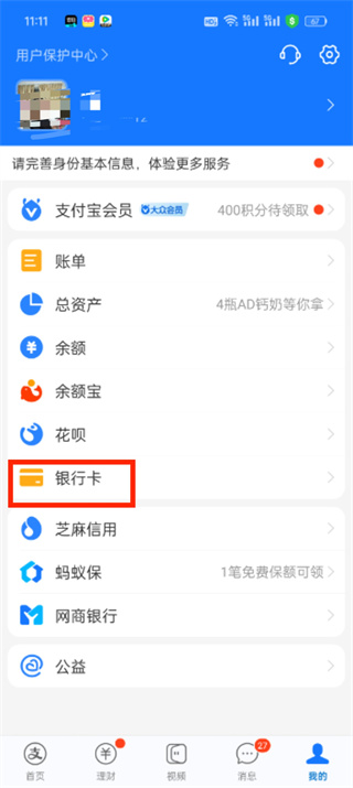 2、在“我的”页面中找到并点击【银行卡】;