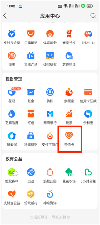 2、在应用中心滑动至“理财管理”列表,找到并点击【亲情卡】;