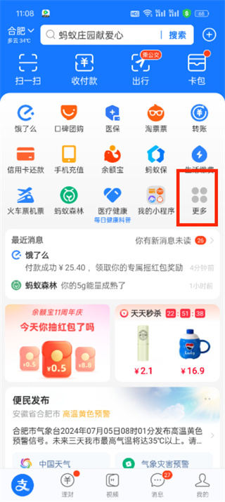1、打开支付宝首页,点击【更多】进入应用中心;
