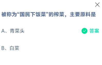 被称为“国民下饭菜”的榨菜,主要原料是?这是今天《支付宝》每日一题的问题,相信我们很多用户都很想知道这个问题的答案是什么?这么一个可以领取饲料的机会相信我们很多用户都不想错过,这里指玩手游网的小编为你带来了2025《支付宝》11月19日每日一题最新答案介绍(2)的全部内容,喜欢的小伙伴欢迎点击进入看看吧。