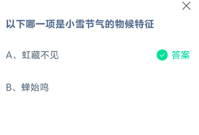 以下哪一项是小雪节气的物候特征?这是今天《支付宝》每日一题的问题,相信我们很多用户都很想知道这个问题的答案是什么?这么一个可以领取饲料的机会相信我们很多用户都不想错过,这里指玩手游网的小编为你带来了2025《支付宝》11月22日每日一题最新答案介绍(1)的全部内容,喜欢的小伙伴欢迎点击进入看看吧。