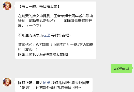 今日问题:在前天的推文中提到,王者荣耀十周年城市联动计划・阿勒泰站活动将在____国际滑雪度假区开展。(三个字)