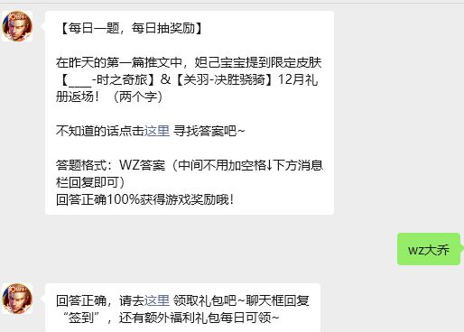 今日问题:在昨天的第一篇推文中,妲己宝宝提到限定皮肤【____-时之奇旅】&【关羽-决胜骁骑】12月礼册返场!(两个字)