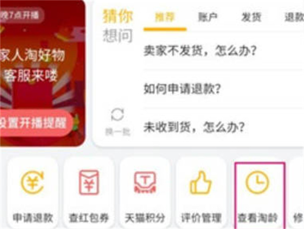 进入客服小蜜后,点击【查看淘龄】。若找不到,可以搜索“查看淘龄”关键词。