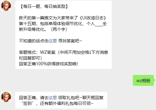 今日问题:昨天的第一篇推文为大家带来了《UI改造日志》第十五期,包括单局体验细节优化、个人____全新升级等优化。(两个字)