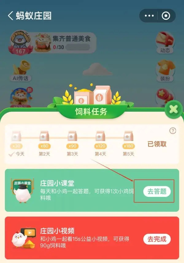 步骤五:答题完成后,点击“去领取”按钮,就可以顺利领取当天的饲料。