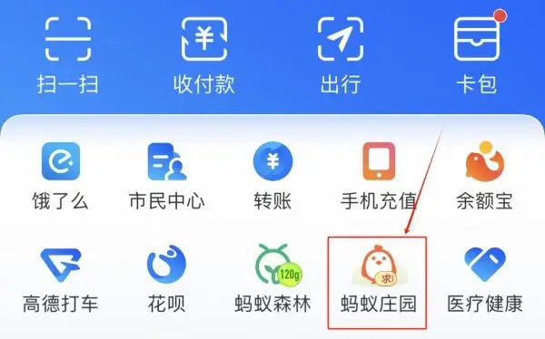 步骤一:打开支付宝,在首页就可以找到并进入“蚂蚁庄园”功能。