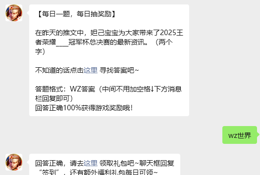 今日问题:在昨天的推文中,妲己宝宝为大家带来了2025王者荣耀____冠军杯总决赛的最新资讯。(两个字)
