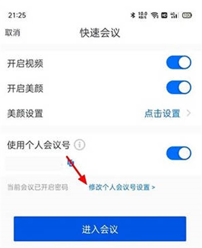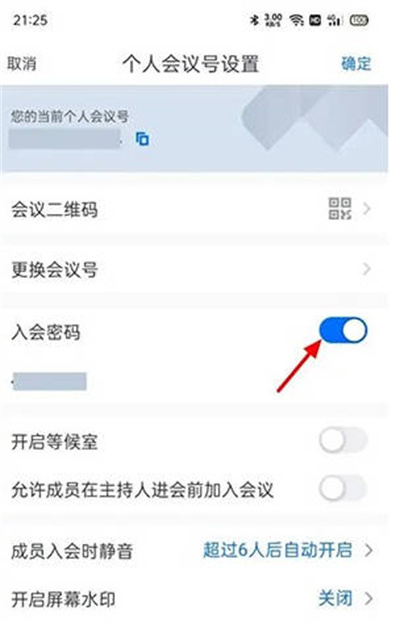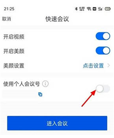 在快速会议页面,点击个人会议号右侧的滑块开启。