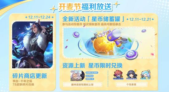 福利方面,“星币储蓄罐”正式上线。从12月11日至12月25日,玩家每日存入10星币,12月26日统一结算,最高可随机翻倍至200%。连续七天存满,还可获得荣耀积分×50。