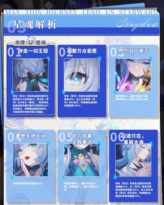 征途只在,星辰大海:持有【军功】的角色全属性抗性穿透提高20%,【军功】触发的附加伤害倍率提高300%;场上存在持有【军功】队友时,刻律德菈全属性抗性穿透提高20%。