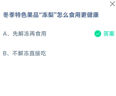 冬季特色果品“冻梨”怎么食用更健康?这是今天《支付宝》每日一题的问题,相信我们很多用户都很想知道这个问题的答案是什么?这么一个可以领取饲料的机会相信我们很多用户都不想错过,这里指玩手游网的小编为你带来了2025《支付宝》12月18日每日一题最新答案介绍(2)的全部内容,喜欢的小伙伴欢迎点击进入看看吧。
