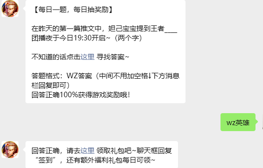 今日问题:在昨天的第一篇推文中,妲己宝宝提到王者____团播夜于今日19:30开启~(两个字)
