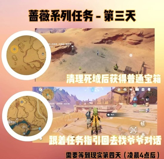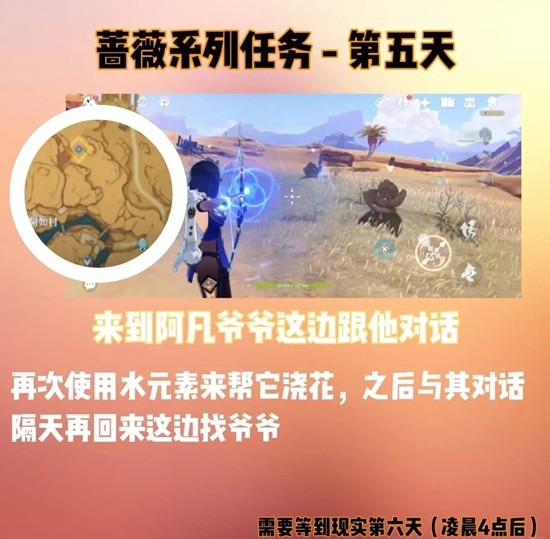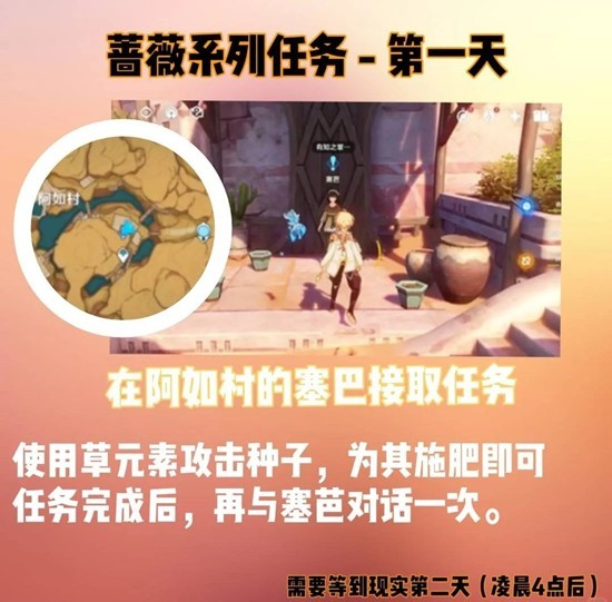 第一天:与 赛芭 对话,提交一朵 须弥蔷薇,获得种子后用 草元素施肥。