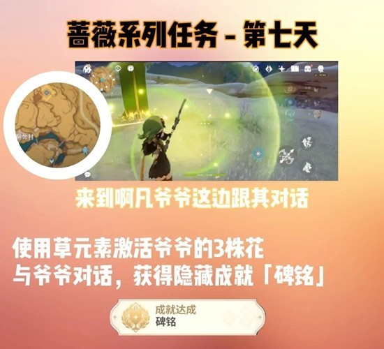 第七天:与 爷爷 对话,用 草元素施肥,完成后再次与爷爷对话,获得隐藏成就 「碑铭」。