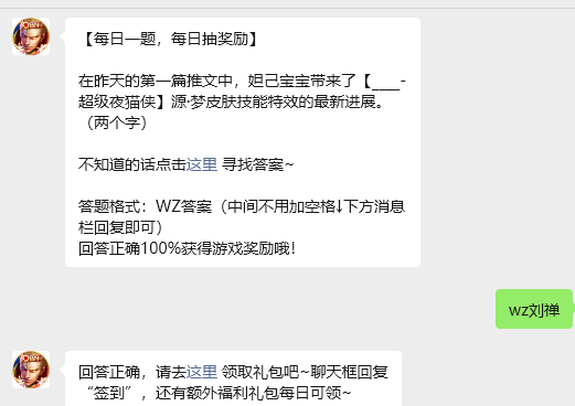 今日问题:在昨天的第一篇推文中,妲己宝宝带来了【____-超级夜猫侠】源·梦皮肤技能特效的最新进展。(两个字)