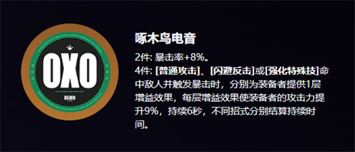 4件效果:普攻、闪避反击或强化特殊技暴击命中时,分别提供1层攻击力+9%增益,持续6秒,各招式单独计时、可独立叠加。