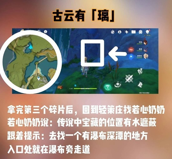 传送回轻策庄找若心奶奶,他会告诉你宝藏位置。传送到锚点往下走,入口就在瀑布旁