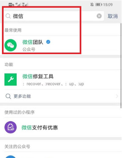 2、在搜索栏输入“微信团队”并查找,点击【微信团队】进入页面。