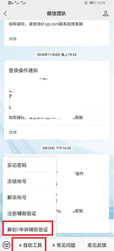 3、在微信团队页面,找到左下角的【自助工具】选项,点击后选择“解封/申诉辅助验证”,按照提示完成操作即可解封账号的朋友圈。