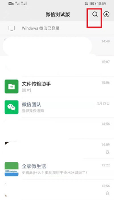 1、打开微信,进入主页面后,点击右上角的【放大镜】图标,进入搜索栏。