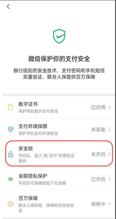 3、进入安全保障后,点击【安全锁】为支付设置密码。