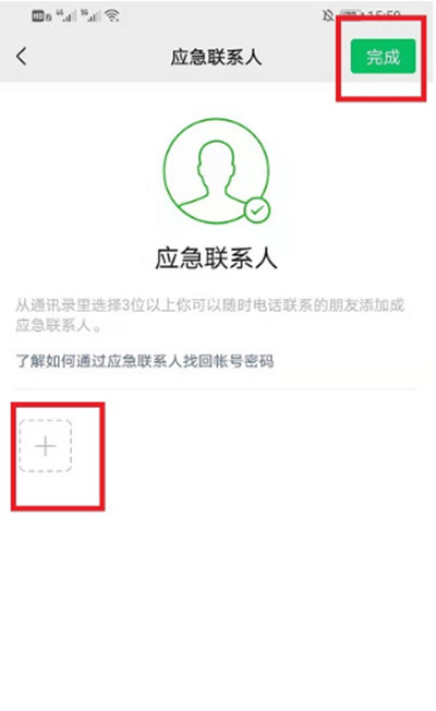 5、在紧急联系人页面,点击【+】添加联系人,选择完成后确认即可成功添加。
