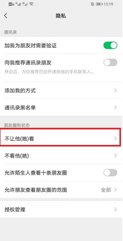 4、在隐私设置中,找到【不让他看】选项,点击进入。