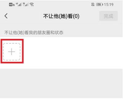 5、在【不让他看】页面,通过【+】添加需要屏蔽的好友。