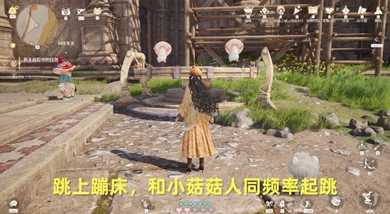 跳上蹦床,与菇菇人一起跳到上方平台;