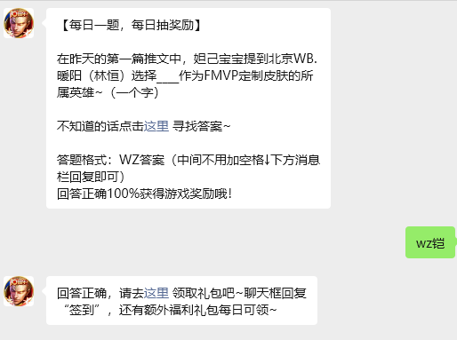 在昨天的第一篇推文中,妲己宝宝提到北京WB.暖阳(林恒)选择____作为FMVP定制皮肤的所属英雄~(一个字),玩家只需要回答对今日的问题,即可获取游戏奖励,那么答案到底是什么呢?现在就让指玩手游网的小编为大家带来关于2026《王者荣耀》1月4日每日一题答案介绍的全部内容吧,感兴趣的小伙伴一定不要错过哦。