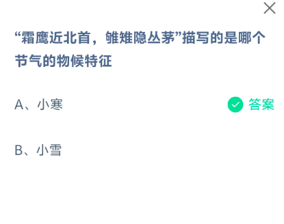 “霜鹰近北首,雊雉隐丛茅”描写的是哪个节气的物候特征?这是今天《支付宝》每日一题的问题,相信我们很多用户都很想知道这个问题的答案是什么?这么一个可以领取饲料的机会相信我们很多用户都不想错过,这里指玩手游网的小编为你带来了2026《支付宝》1月5日每日一题最新答案介绍(2)的全部内容,喜欢的小伙伴欢迎点击进入看看吧。
