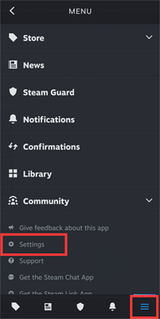 1、打开Steam App,点击右下角的“三”图标,进入“Settings”(设置)。