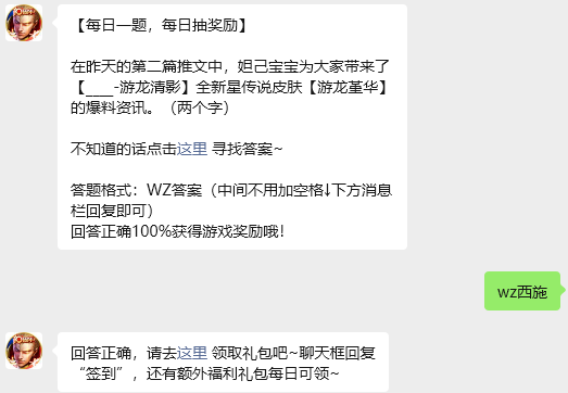 今日问题:在昨天的第二篇推文中,妲己宝宝为大家带来了【____-游龙清影】全新星传说皮肤【游龙堇华】的爆料资讯。(两个字)