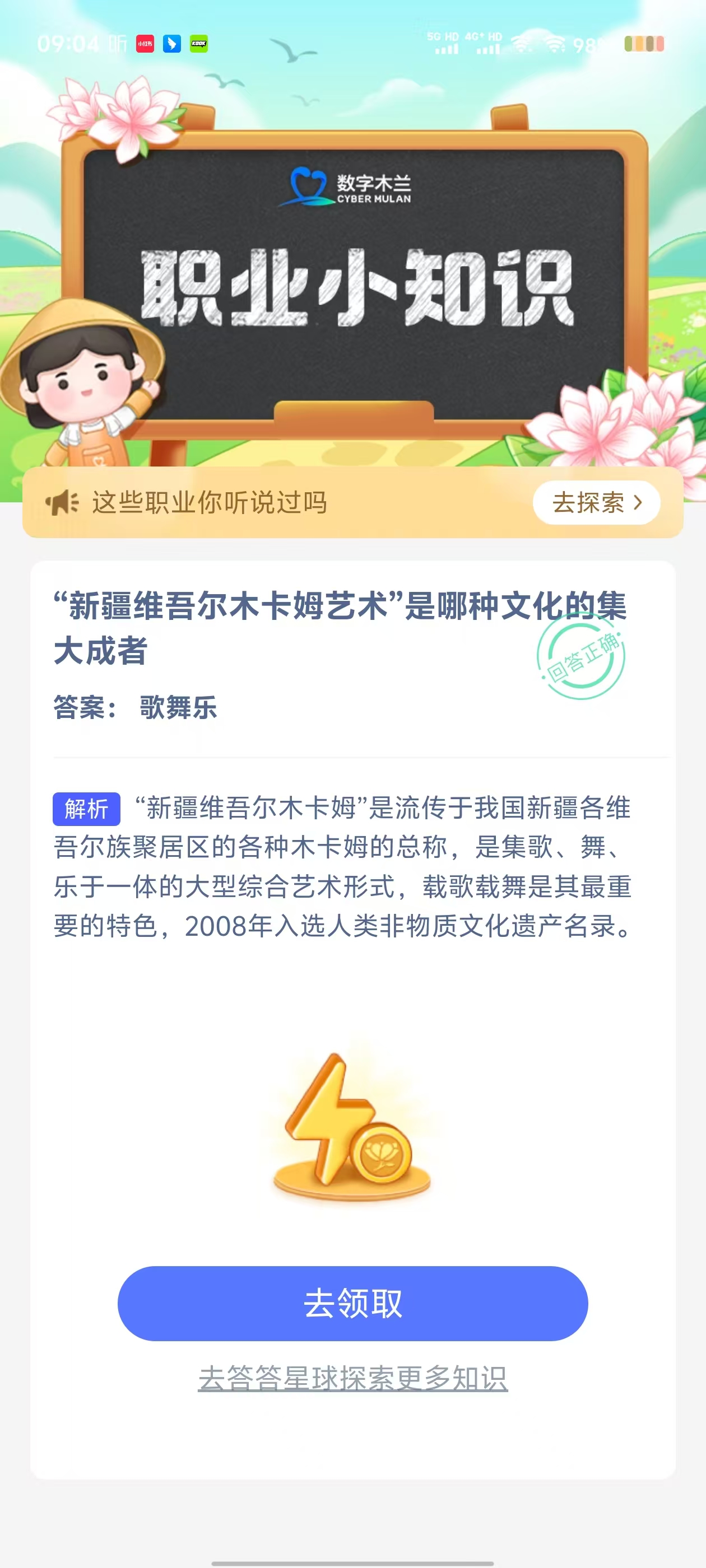 2、在【职业小知识问答】对话框中,点击【去完成】进入答题页面;