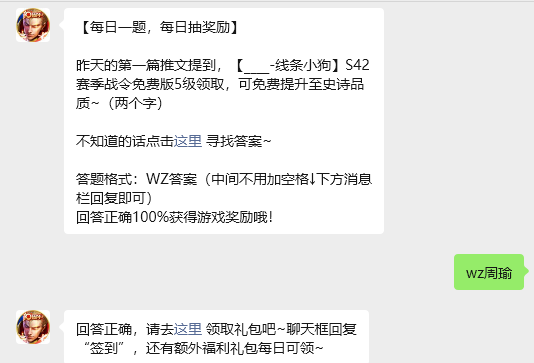 今日问题:昨天的第一篇推文提到,【____-线条小狗】S42赛季战令免费版5级领取,可免费提升至史诗品质~(两个字)