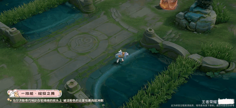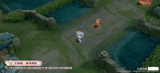 4、三技能:小乔头顶浮现马尔济斯加油鼓劲,脚下展开温馨小狗绘图,无数星光小礼物从空中落下,如童趣满满的治愈雨。
