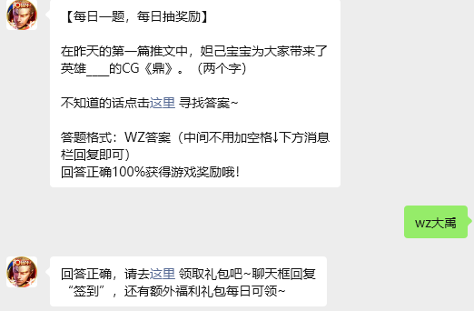 今日问题:在昨天的第一篇推文中,妲己宝宝为大家带来了英雄____的CG《鼎》。(两个字)
