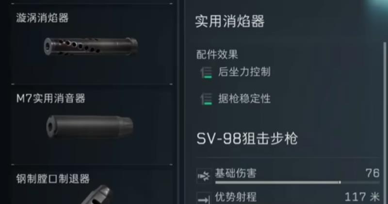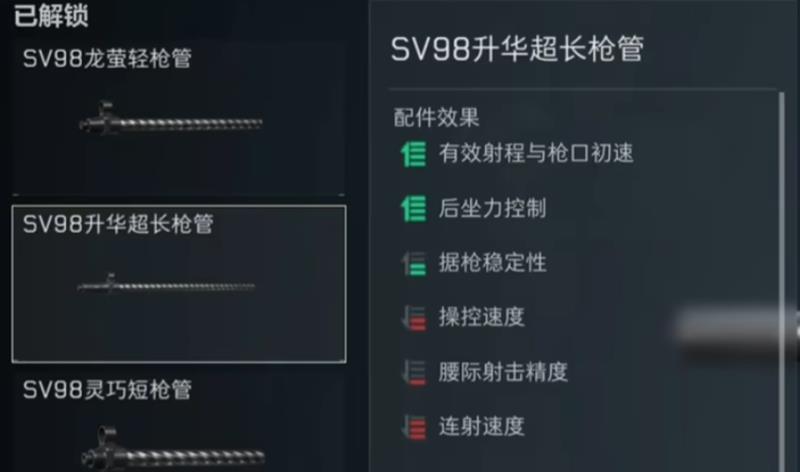 枪管:推荐使用 SV98升华超长枪管,可显着提升射程、控制后座,并增强据枪稳定性,是核心配件之一。