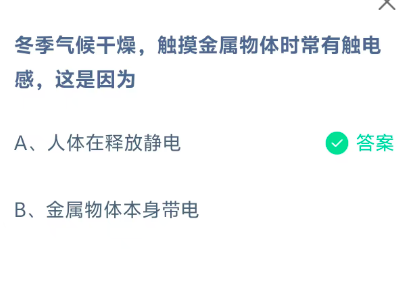 冬季气候干燥,触摸金属物体时常有触电感,这是因为?这是今天《支付宝》每日一题的问题,相信我们很多用户都很想知道这个问题的答案是什么?这么一个可以领取饲料的机会相信我们很多用户都不想错过,这里指玩手游网的小编为你带来了2026《支付宝》1月11日每日一题最新答案介绍(2)的全部内容,喜欢的小伙伴欢迎点击进入看看吧。